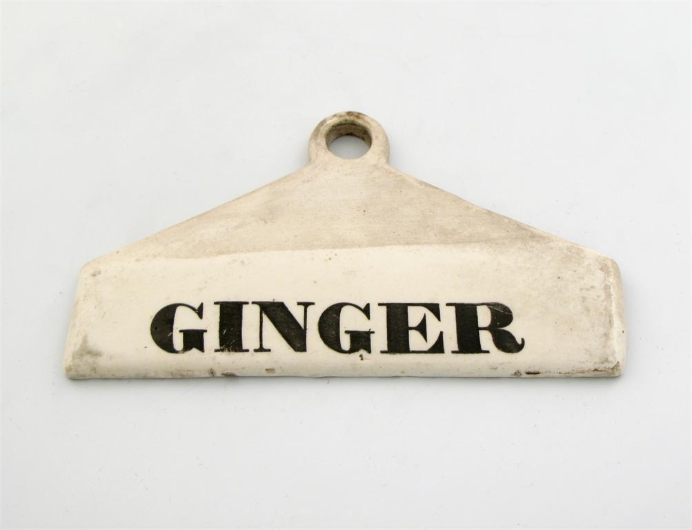 A 19th century ceramic bin label, unmarked, tapering rectangular form, plain ring terminal, titled, 'GINGER', length 14.2cm.