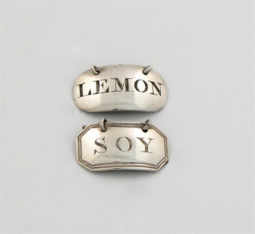 rounded rectangular form, incised 'LEMON', length 2.8cm, plus a George III silver sauce label of rectangular form, reeded border, incised 'SOY', by John Holloway, London 1797, length 2.7cm. (2)