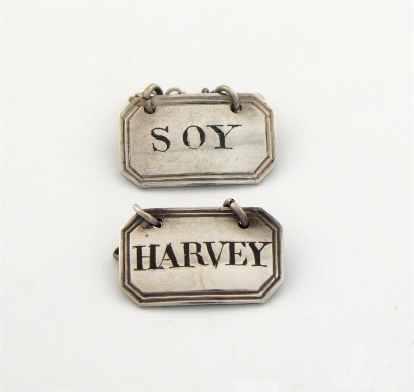 A pair of Victorian silver sauce labels, by Andrew Crespel and Thomas Parker, London 1864, rectangular form, canted corners, reeded borders, blackened 'HARVEY' and 'SOY', length 2.4cm. (2)