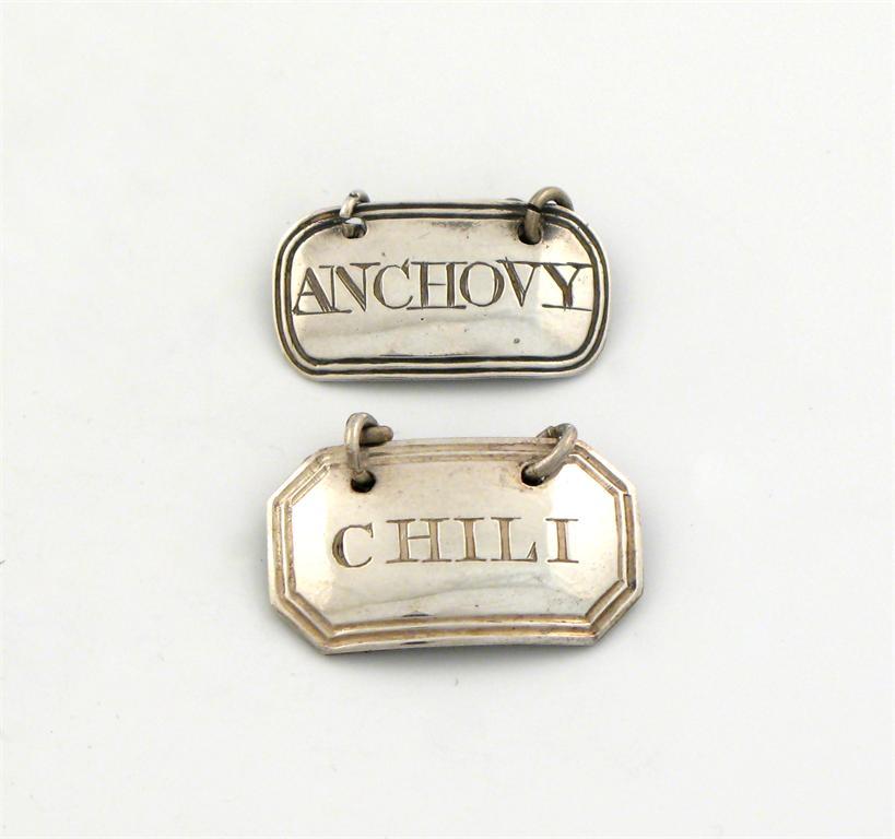 rectangular form, canted corners, incised 'CHILI', length 2.5cm, plus a George III silver sauce label, maker's mark of John Reily, London circa 1810, oblong form, incised 'ANCHOVY', length 2.3cm. (2)