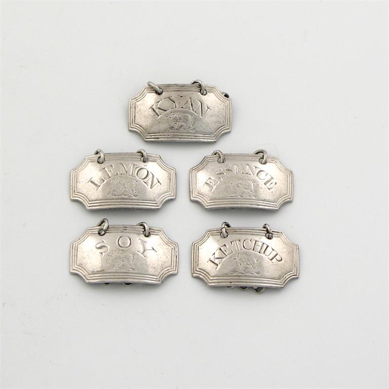 A set of five George III silver sauce labels