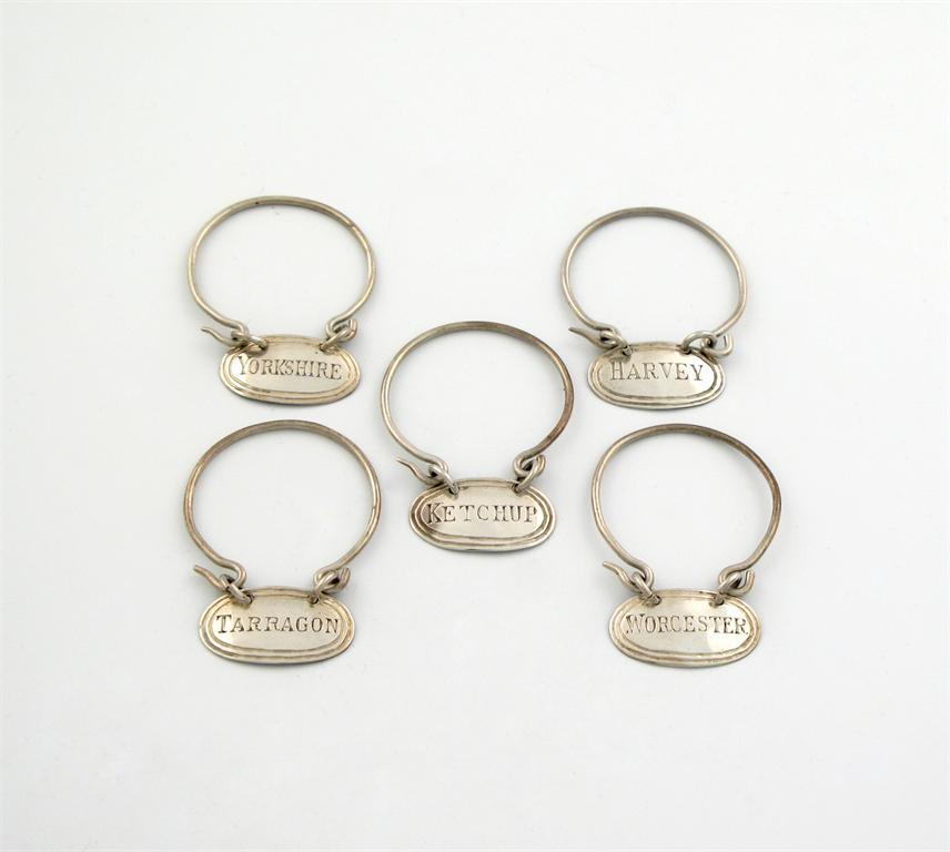 ensuite to the pevious lot, oblong form, reeded border, incised 'WORCESTER', 'KETCHUP', 'TARRAGON', 'YORKSHIRE' and 'HARVEY', the ring mounts detachable one side, length 2.5cm. (5)