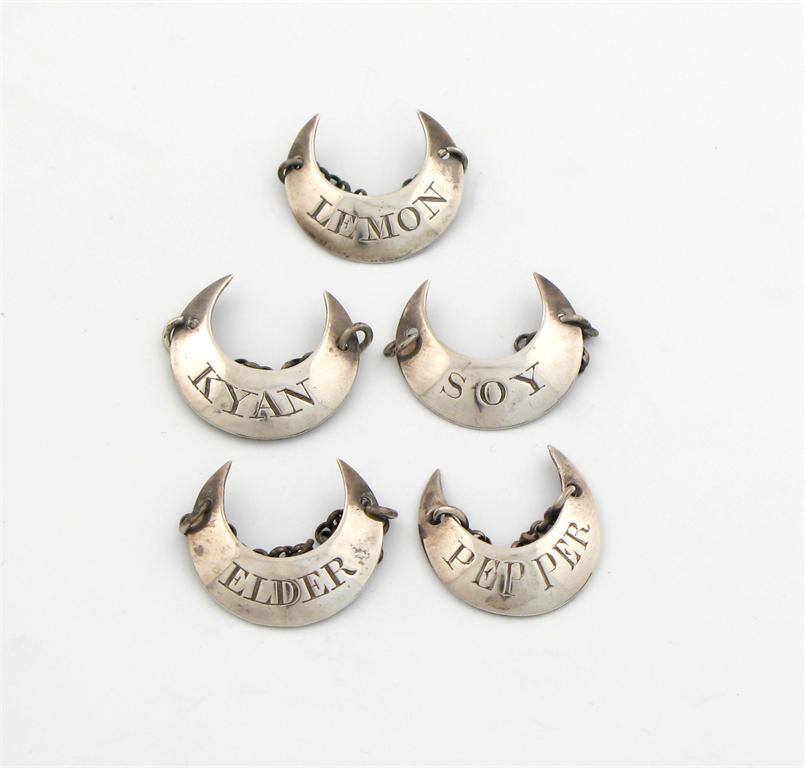 A set of five George III silver sauce labels, maker's mark only, that of Phipps and Robinson, London circa 1790, one label unmarked, crescent form, incised 'ELDER', 'KYAN', 'ELDER', 'LEMON', and 'PEPPER', length 2.1cm. (5)
