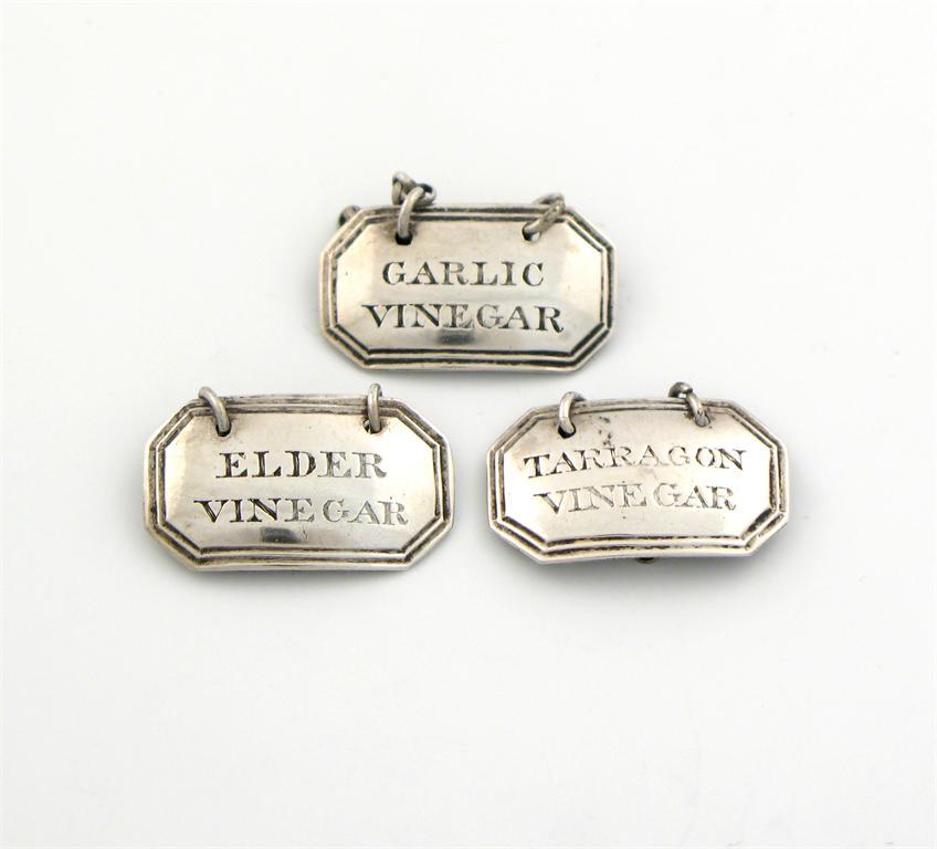 A set of three George IV silver sauce labels, by Charles Rawlings, London 1825, rectangular form, canted corners, reeded borders, incised 'ELDER VINEGAR', 'GARLIC VINEGAR' and 'TARRAGON VINEGAR ', length 2.4cm. (3)