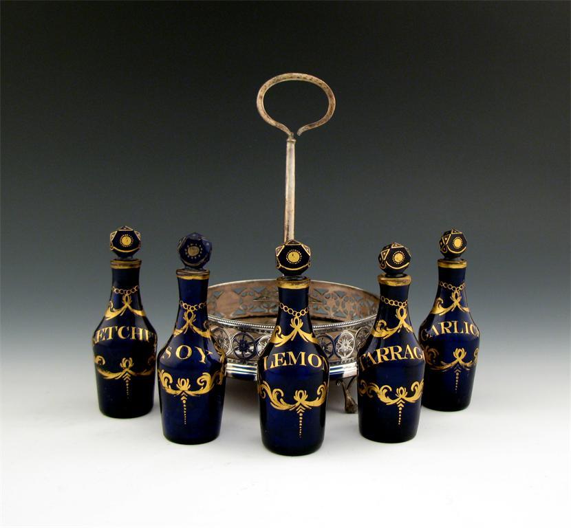 A set of five late 18th century blue glass sauce bottles, in an associated George III silver cruet frame,