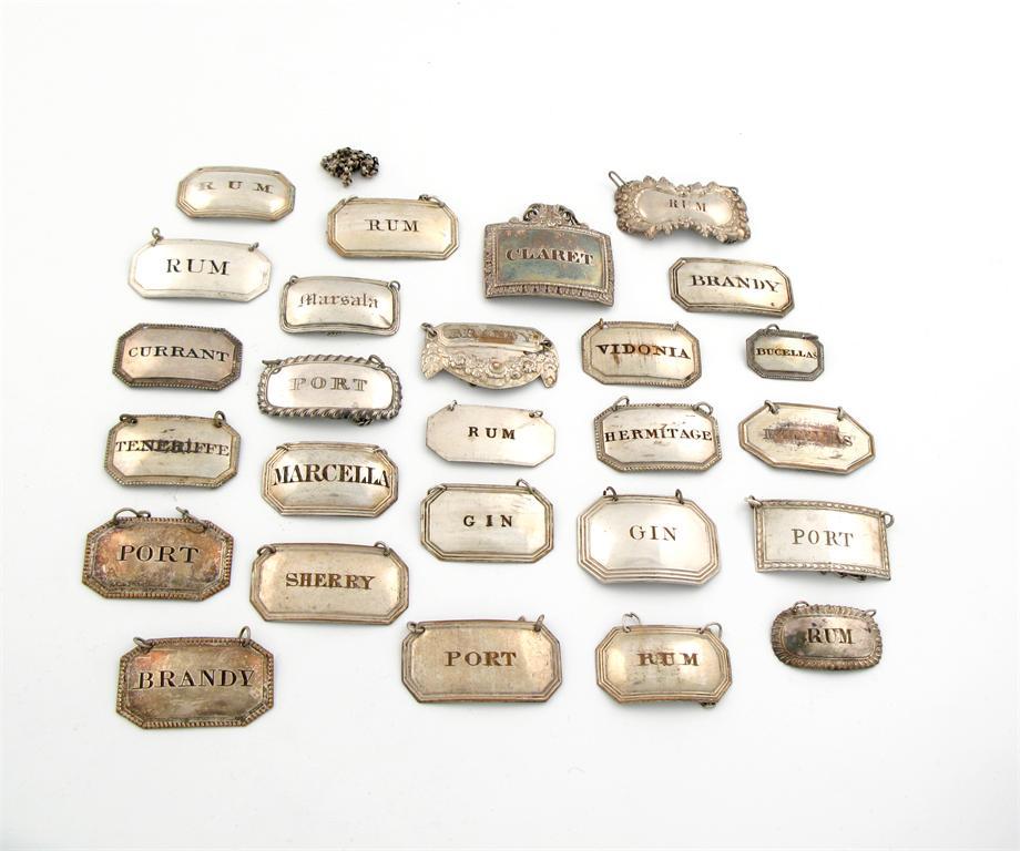 comprising one of large rectangular form, 'CLARET', plus a set of six with beaded borders, 'VIDONIA', 'HERMITAGE', 'BRANDY', 'PORT', 'CURRANT' AND 'TENERIFFE,' plus two 'BUCELLAS' and other examples. (26)