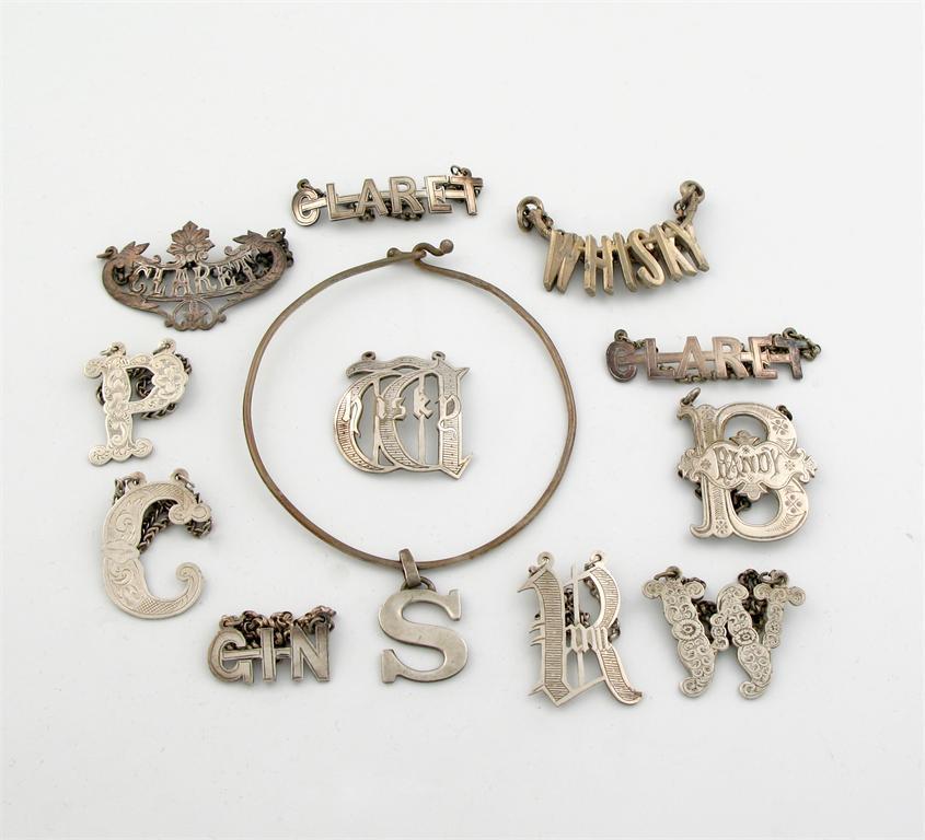A collection of 'cut out letter' wine labels, comprising: a modern silver 'S' label, on a large ring, electroplated examples: a pair of 'CLARET' labels, another 'CLARET', a 'GIN' and 'WHISKY', plus the letters 'W' x2, 'R', 'B', 'P' and 'C'. (12)