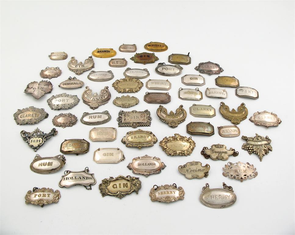 A large collection of electroplated wine labels, including four similar scroll and foliate mounted, GIN', 'BRANDY', 'SCHIEDAM' and 'BRANDY', plus many other examples including 'BITTERS'. (qty)