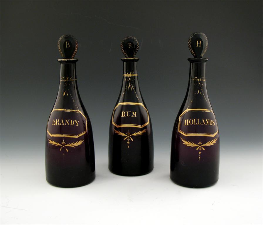 A set of three late 18th / early 19th century amethyst coloured glass decanters