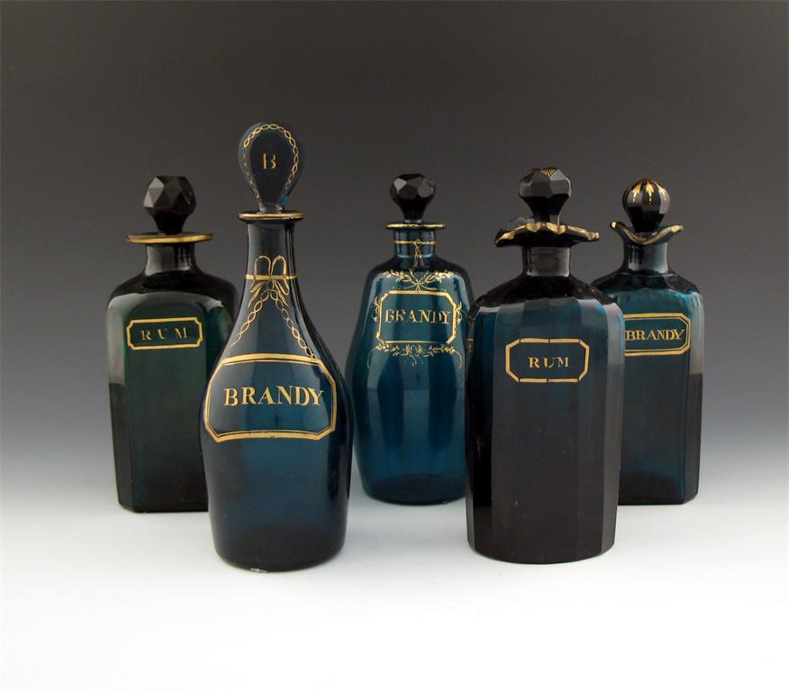 comprising three of faceted form, gilt highlights and titled 'RUM', x2, and 'BRANDY', plus two of mallet form, both titled 'BRANDY', one with a tear drop shaped stopper initialled 'B', height 23.3cm. (5)