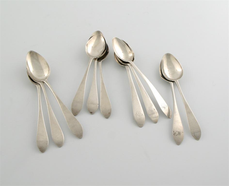 comprising: a George III set of six by Matthew Craw, Edinburgh circa 1805, one by John Cornfute, Perth circa 1780, a set of three by A.S, possibly Alexander Stewart, and one other Edinburgh spoon, approx. weight 4oz. (11)