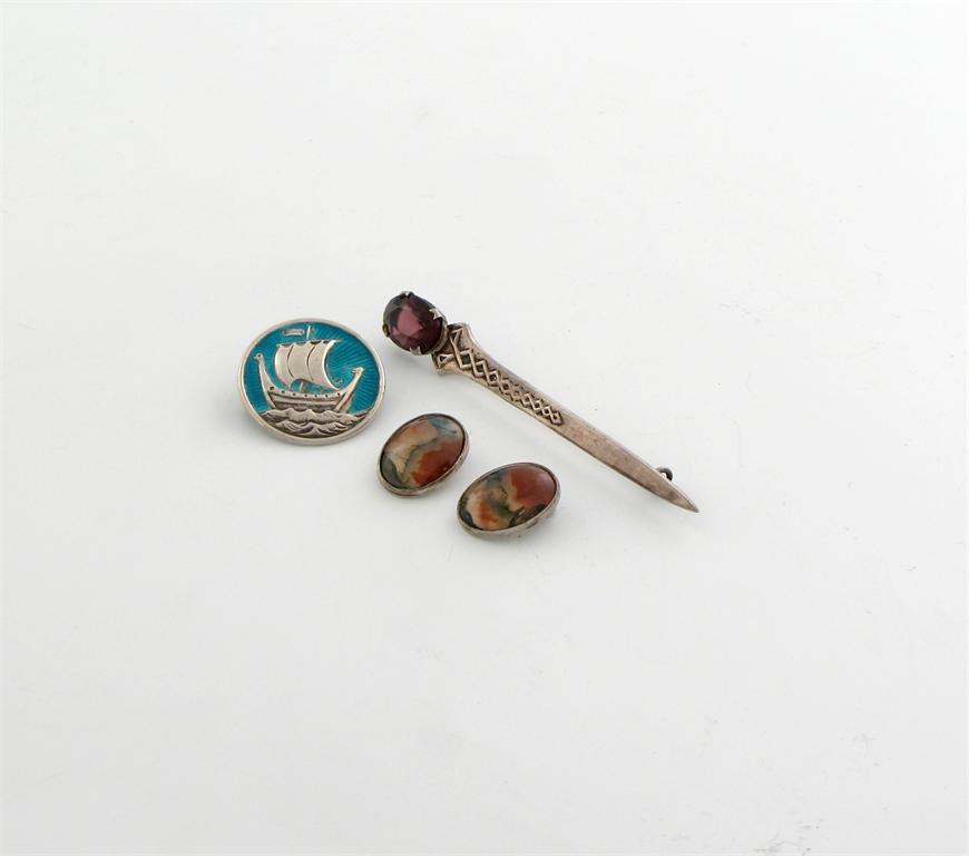 comprising a pair of provincial silver mounted hard stone earrings, by John Hart, Iona, oval form, plus a dagger brooch, Celtic decoration, set with a purple finial, by Robert Allison, Edinburgh 1957, and a modern silver and enamel brooch, circular form, with a longboat and enamel background, Birmingham 1954. (4)