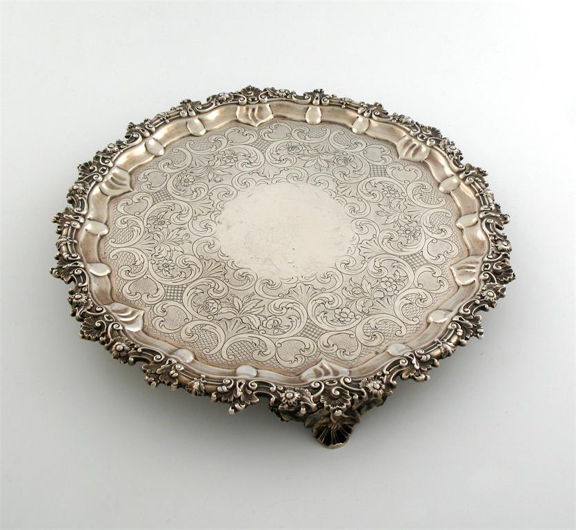 An early Victorian Scottish silver salver, by J. McKay, Edinburgh 1837, circular form, engraved foliate scroll decoration, shell and foliate border, on four foliate shell bracket feet, diameter 34cm, approx. weight 32oz.