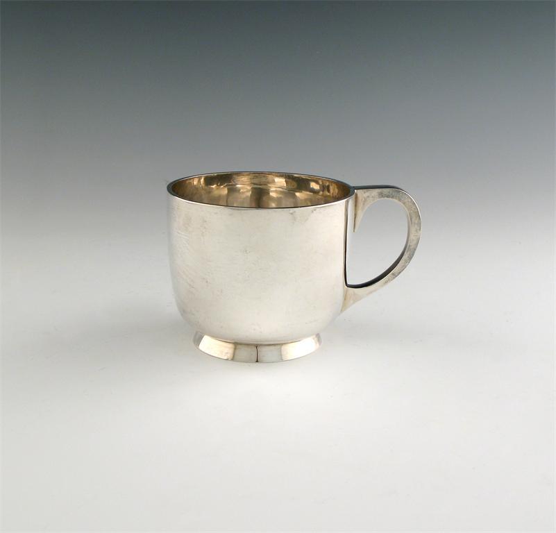 A Scottish silver mug, possibly by Lawson and Co, Glasgow 1915, plain circular form, scroll handle, on a circualr foot, height 7.2cm, approx. weight 5oz.