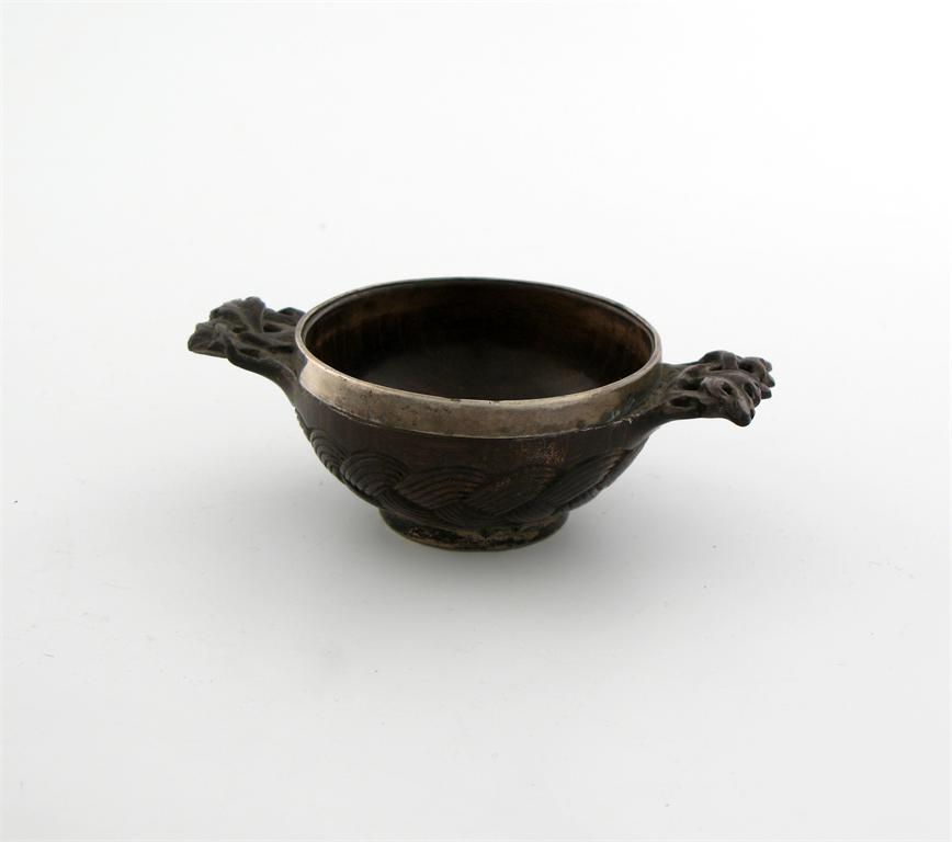 A late 19th century Scottish provincial silver mounted wooden quaich