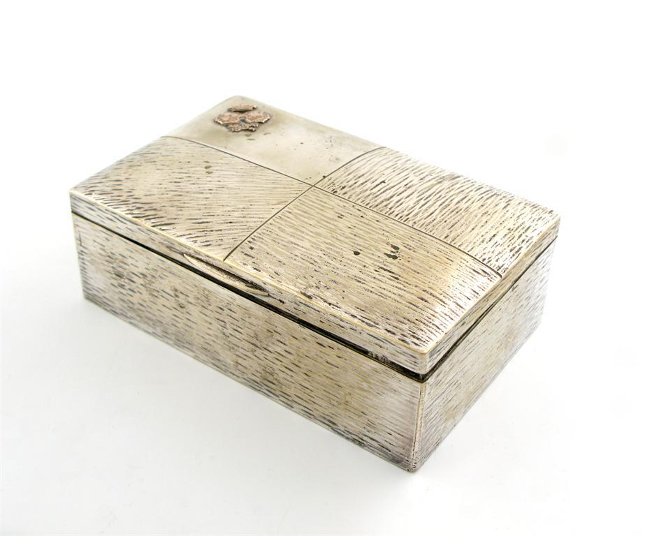 A continental electroplated cigarette box, rectangular form, the hinged cover with alternate panels of textured and plain decoration, applied with two armorials and dated '29 Mai 1904', length 18.8cm.