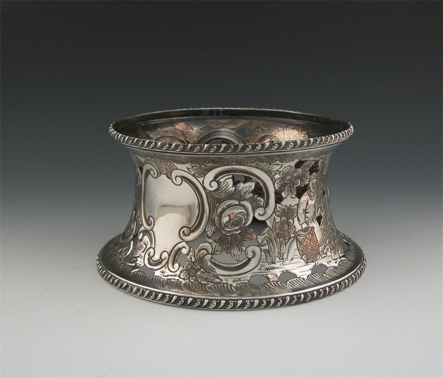 An old Sheffield plated dish ring, circular form, embossed and pierced with figures in foliate landscapes with birds, gadroon borders, diameter of base 21cm.