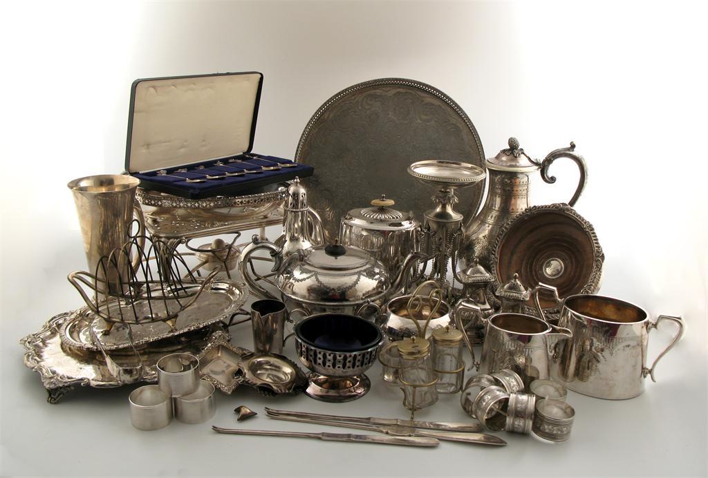 comprising: a pair of wine coasters, a salver, an epergne stand, a golf trophy, a three piece tea set, a coffee pot, a swing handled basket and other items. (qty)