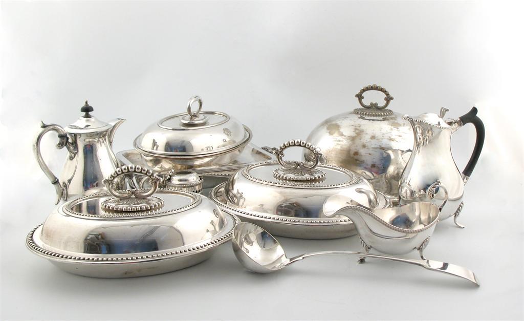 A mixed lot of electroplated items, comprising: a meat dish cover, a pair of oval entree dishes and covers, two water jugs, a sauce boat, a mustard pot, a warming base, an entree dish and a soup ladle. (qty)