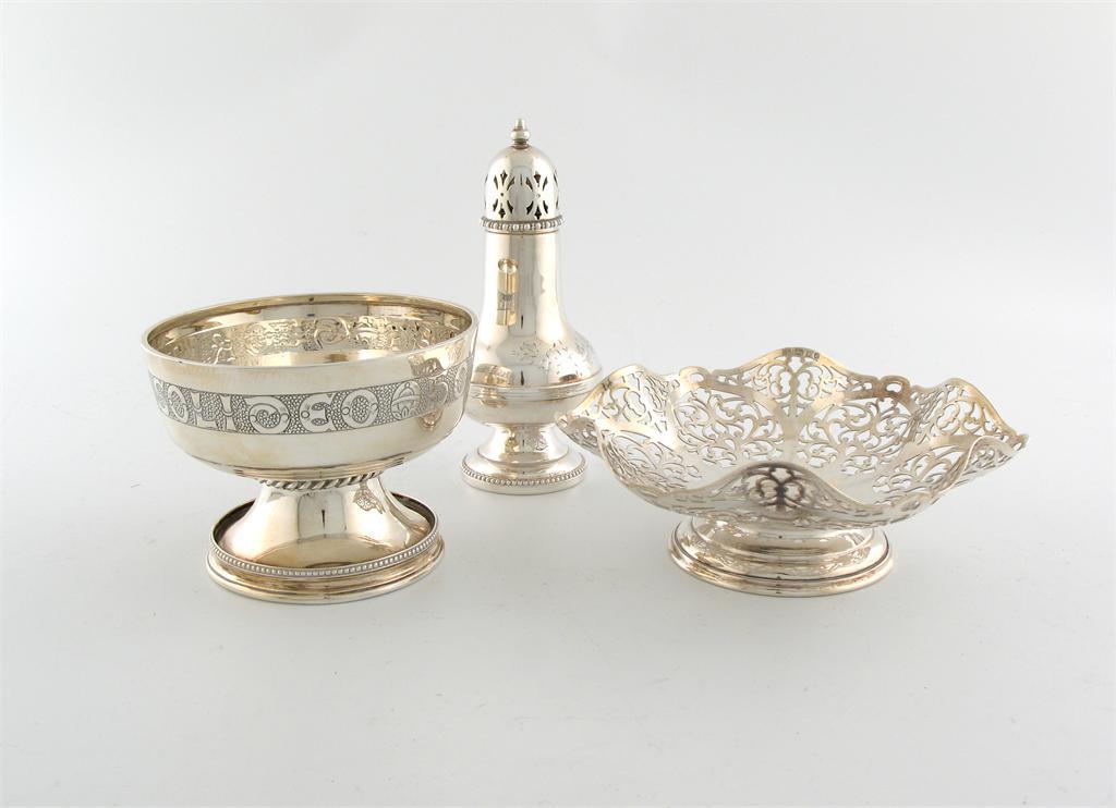 A silver reproduction bowl, maker's mark worn, London 1924, circular form, the body with a chased inscription, on a circular foot, plus a pierced silver dish and an electroplated sugar caster, approx. weight 16oz. (3)