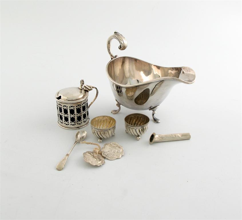 comprising: a mustard pot with pierced decoration, Birmingham 1912, a pair of salt cellars of fluted circular form, a pair of buttons and a button hole posy holder, plus an electroplated sauce boat, approx. weighable 3oz. (7)