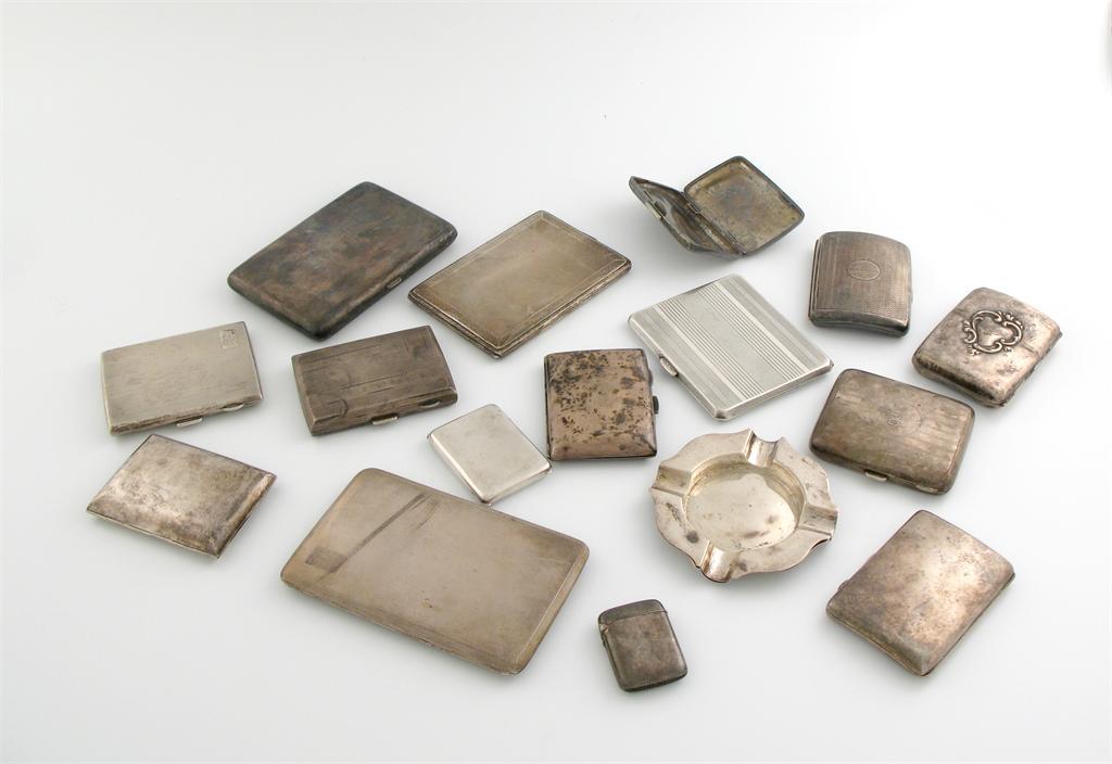 A mixed lot of silver items, various dates and makers, comprising: thirteen cigarette cases, a vesta case, a match box cover and an ashtray, approx. weight 40oz. (qty)