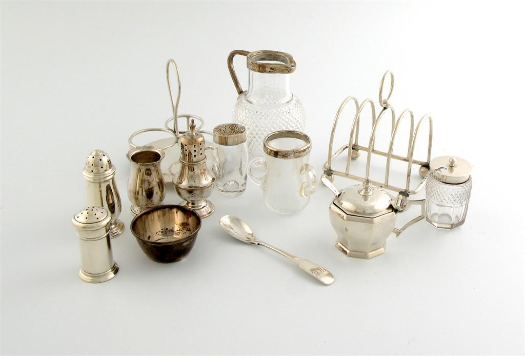 A mixed lot of silver items, various dates and makers, comprising: a toast rack, a cruet frame, four pepper pots, two mustard pots, a small dish, a silver mounted glass cream jug, (a.f), and a glass vesta holder, approx. weighable 10oz. (qty).
