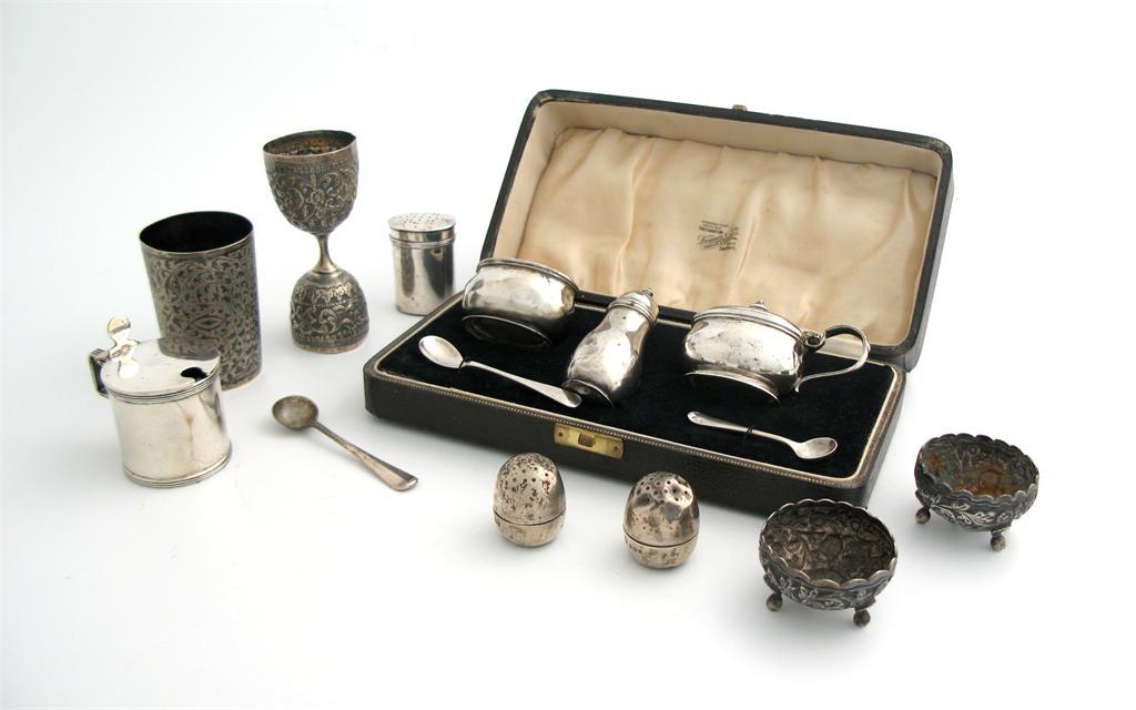 comprising: a Russian beaker of tapering circular form, with foliate scroll niello decoration, a cased three-piece condiment set with two spoons, a mustard pot, three pepper pots, an Indian double measure and a pair of Indian salt cellars, approx. weighable 10oz. (qty)