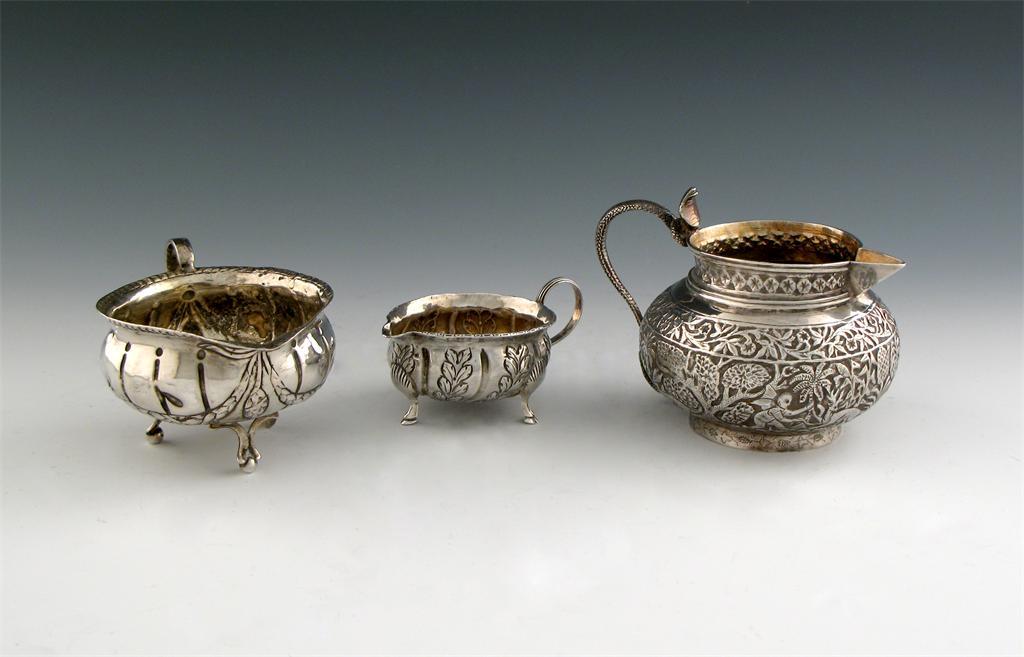 A collection of three silver cream jugs, comprising: an Indian jug of circular form, chased decoration, snake handle, plus a cream jug of circular form, punch bead bead border, and a small cream jug, approx. weight 8oz. (3)