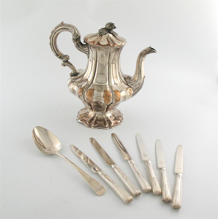 comprising: a set of six George III silver fruit knives, London 1814, with fluted handles, the blades engraved with a crest, plus a silver old English pattern tablespoon, Exeter 1804, and an old Sheffield plated coffee pot, of lobed circular form, leaf capped scroll handle. ( 8)