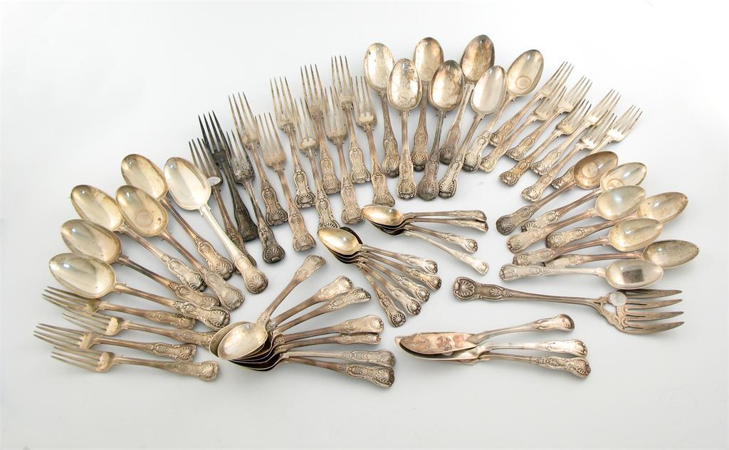 comprising: eleven table forks, eleven desert forks, thirteen tablespoons, fourteen dessert forks, nine teaspoons, three butter knives, and a fish serving fork, approx. weight 150oz.