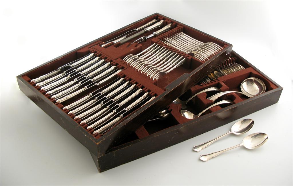 comprising: eleven table forks, twelve dessert forks, twelve table knives, twelve dessert knives, twelve dessert spoons, eight large soup spoons, four small soup spoons, eight tablespoons, twelve teaspoons, twelve coffee spoons, a soup ladle, and a pair of sauce ladles, in two fitted trays, approx. weighable 140oz. (qty)