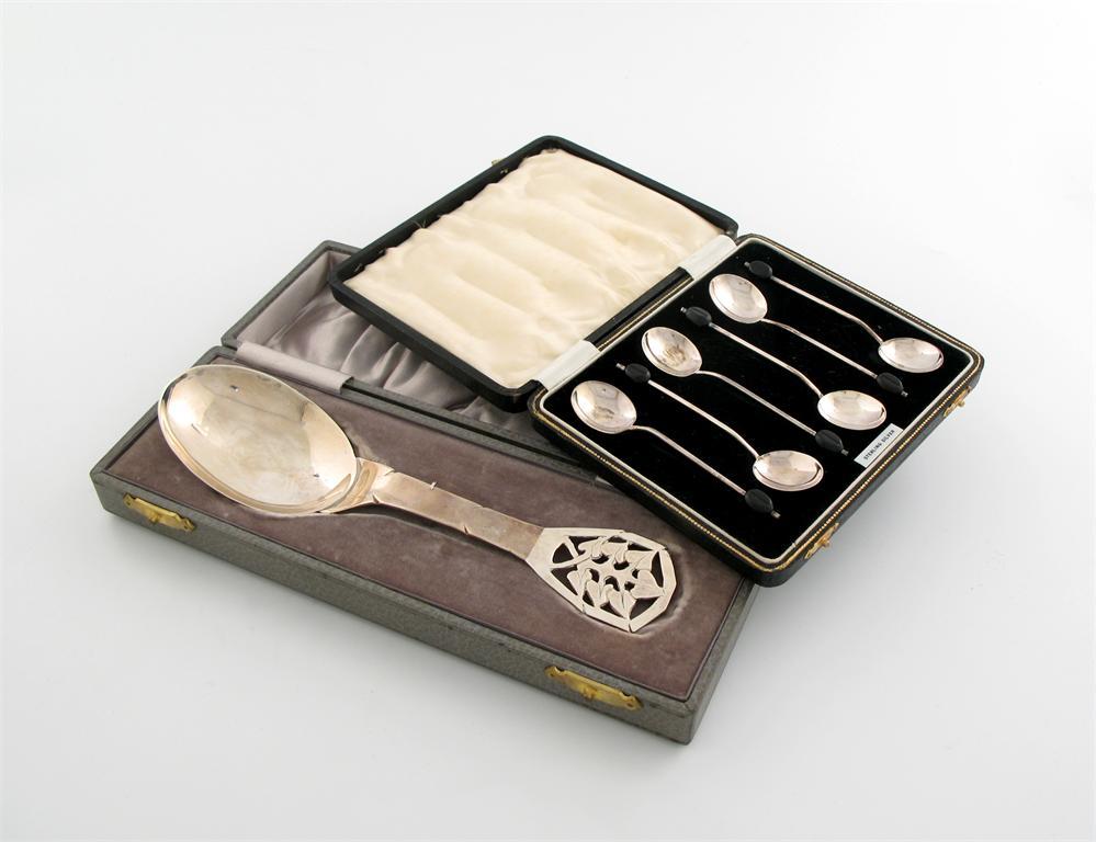 An Arts and Crafts silver spoon, unmarked, oval bowl, the terminal pierced with a foliate motif, in a fitted case, plus a cased set of six silver coffee bean end spoons. (2)
