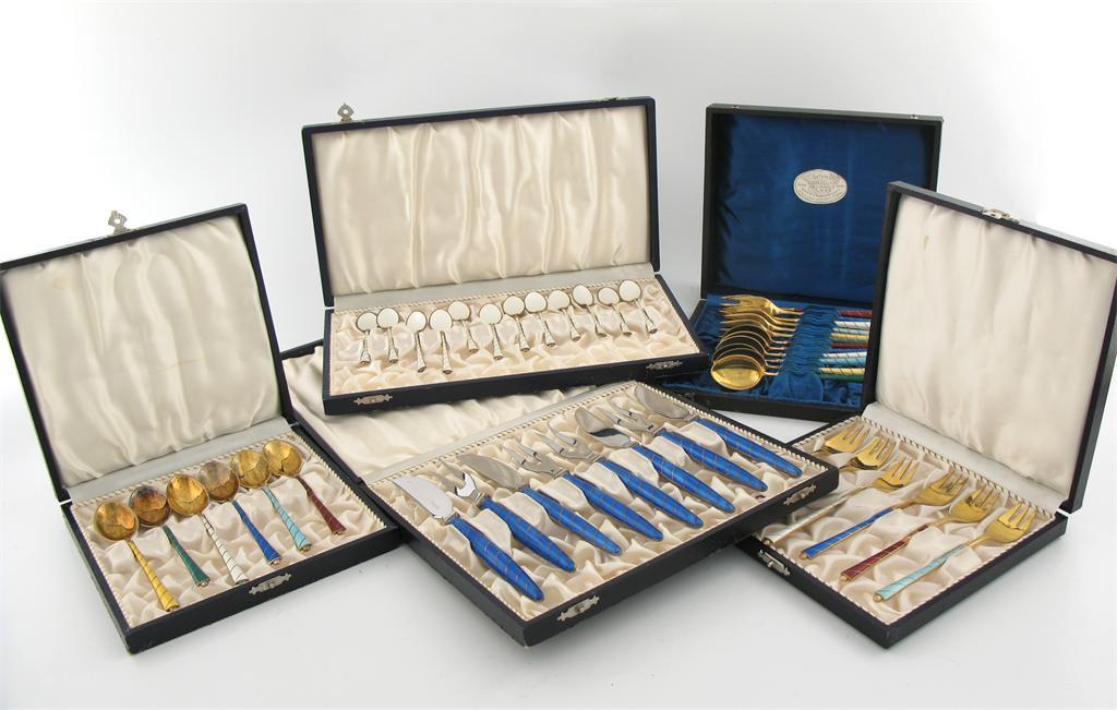 A collection of cased Danish silver-gilt and enamel teaspoons and forks