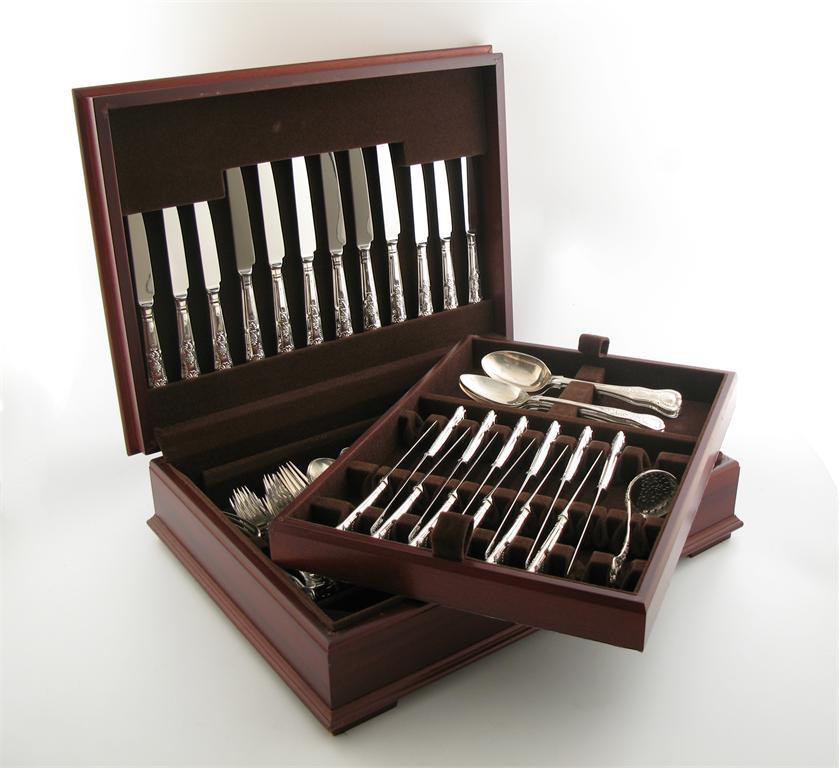 comprising: eighteen tablespoons, twelve table forks, twelve dessert forks, twelve dessert spoons, plus twelve modern table knives and twelve modern dessert knives, and a Queen's pattern sifting ladle, in a fitted case, approx. weighable 150oz. (qty)