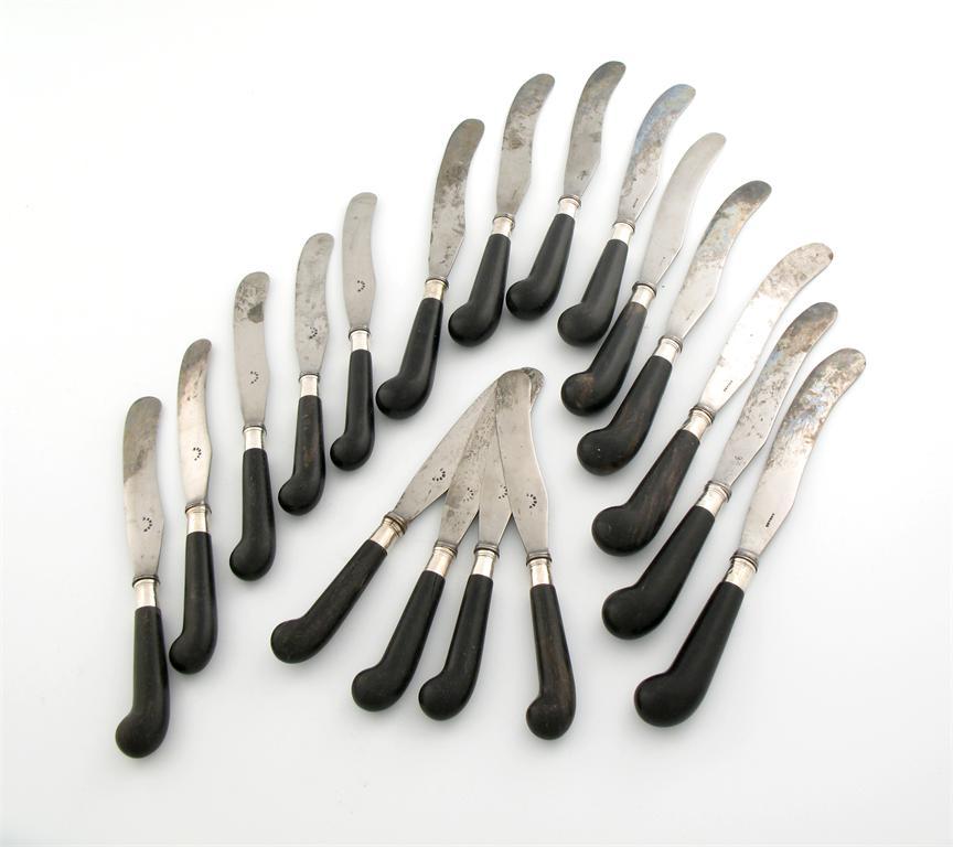 A set of nine ebony handled table knives and nine dessert knives
