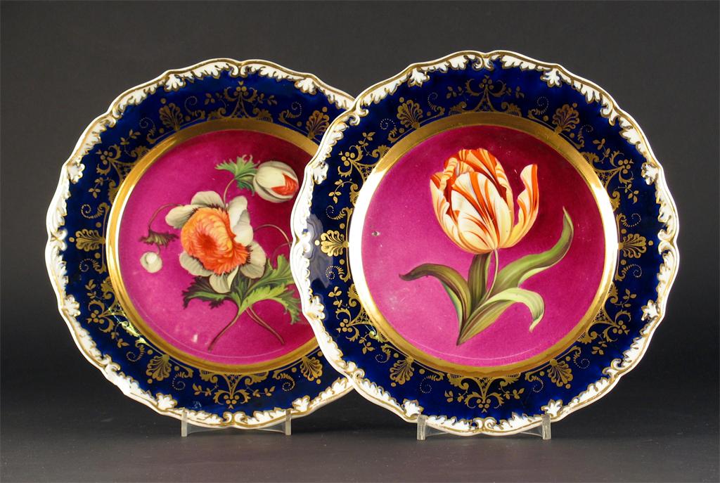 A pair of Samuel Alcock plates, one painted with a poppy, the other with a tulip, each on a cerise ground within blue and gilt borders, '5' impressed. One with a rim chip, c.1840, 24.5cm. (2)