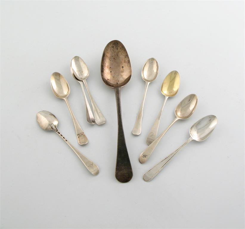A mixed lot of silver flatware, various dates and makers, comprising: a Scottish teaspoon, by Adam Graham, Glasgow circa 1770, a Newcastle tablespoon, 1780, plus four Hanoverian pattern teaspoons and three others, approx. weight 6oz. (9)