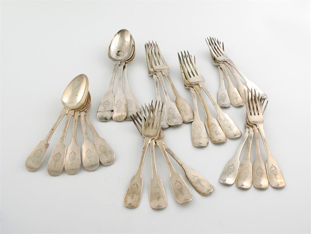 the terminals with a crest and motto, comprising: six table forks, three tablespoons, twelve dessert forks, and five dessert spoons, approx. weight 50oz. (26)