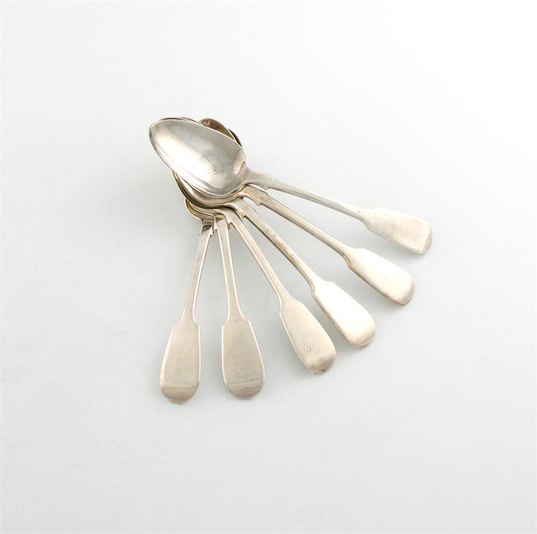 A set of six early Victorian silver Fiddle pattern dessert spoons