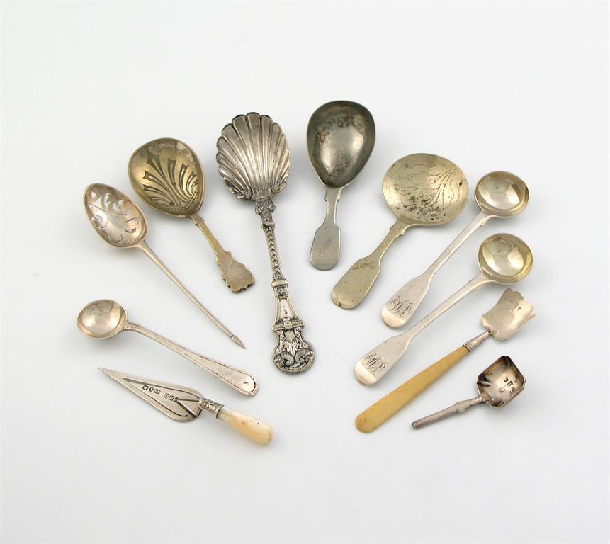 A mixed lot of silver flatware, various dates and makers, comprising: a mote spoon, maker's mark partially worn, five various salt spoons, a book mark trowel, and three electroplated caddy spoons and a sugar sifting spoon. (11)