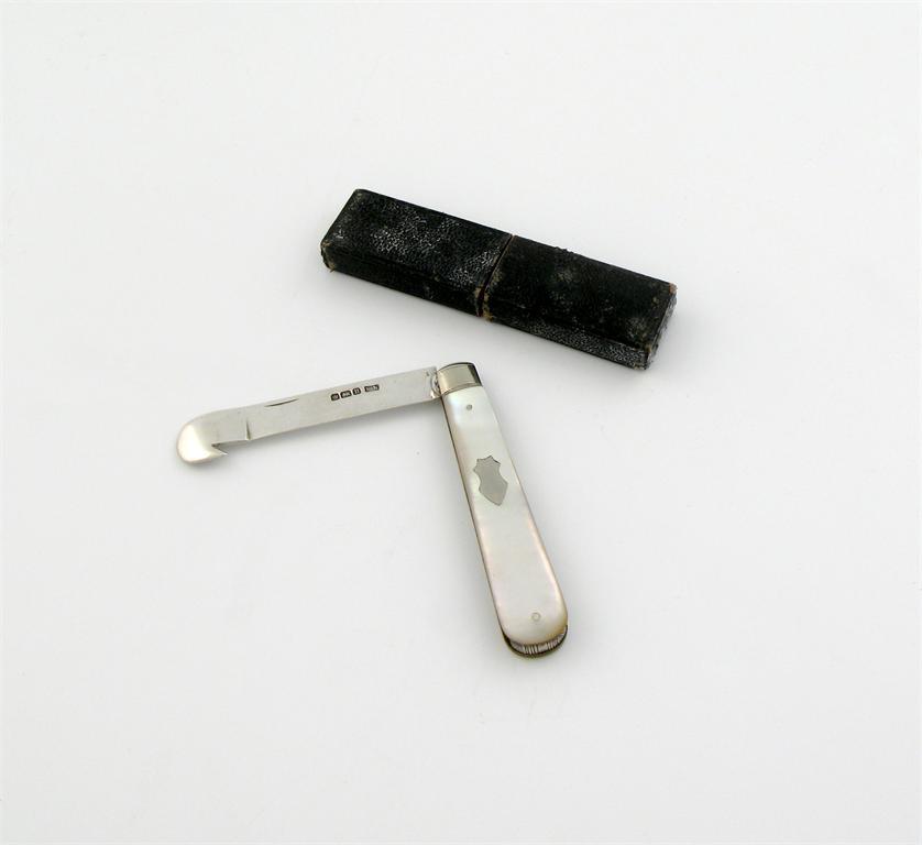 A silver folding orange peeler knife, by William Needham, Sheffield 1912, with a mother-of pearl handle, in a case, length open 14.8cm.