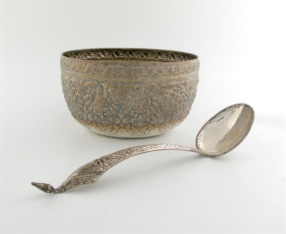 A Burmese metal-ware rice bowl and spoon, unmarked, circular form, embossed foliate decoration, the spoon with an embossed figure, diameter 23.3cm. (2)