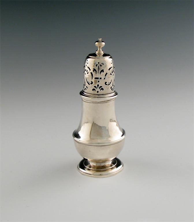 A George I silver caster, by Samuel Weldon, London 1721, baluster form, pull-off pierced cover with a knop finial, on a circualr foot, height 12.7cm, approx. weight 3oz.