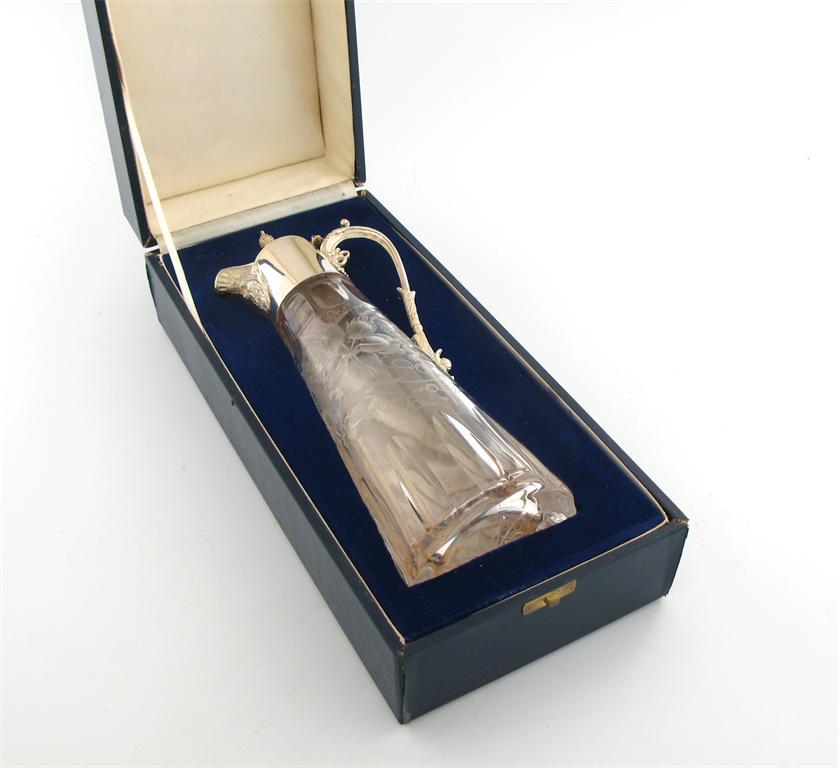 A modern silver-mounted claret jug, by C. J. Vander, Birmingham 1986, tapering circular form, the body with trailing vine decoration, the mount with a scroll handle and domed hinged cover, height 30.5cm, in a fitted case.