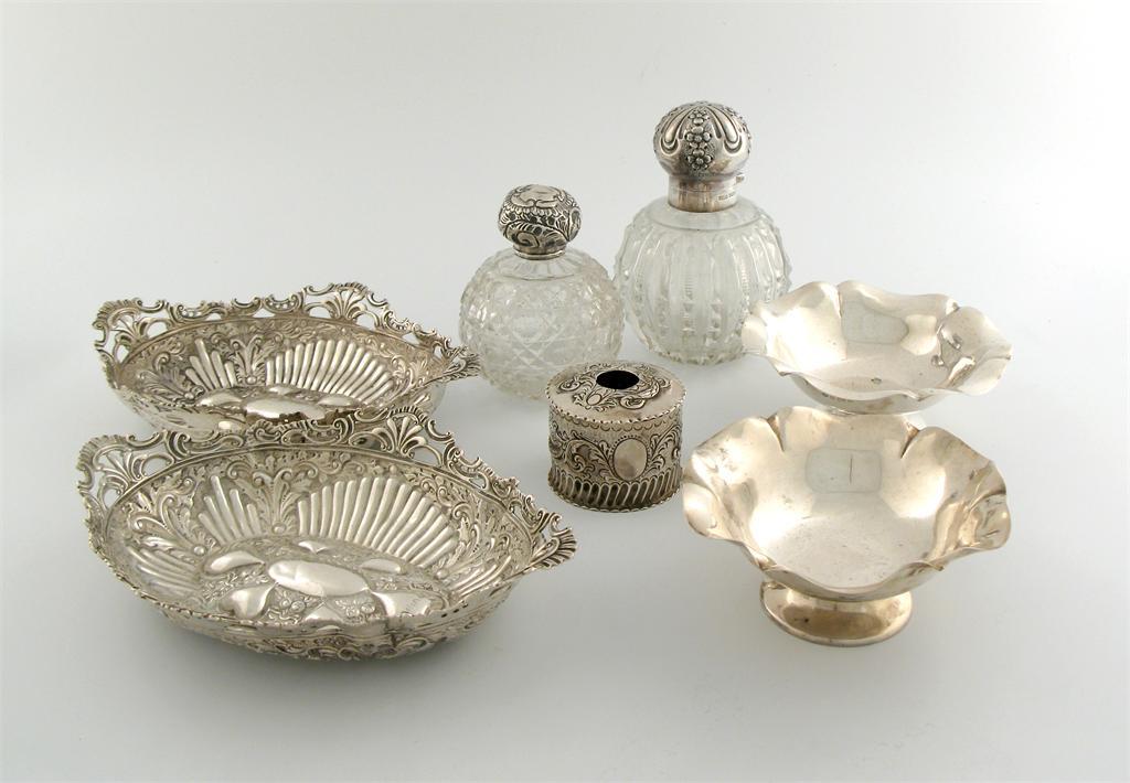 oval form, embossed foliate and fluted decoration, pierced foliate scroll border, length 22cm, plus a pair of silver dishes, Birmingham 1902 and 1903, and two silver mounted cut glass scent bottles, and a hair tidy, London 1878, approx. weighable 20oz. (7)