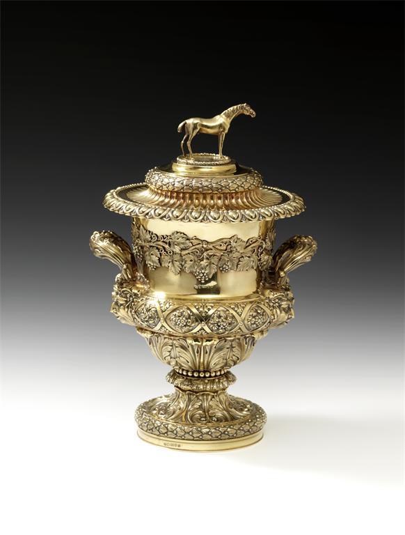 campana form, heavily embossed with foliate decoration, and applied with a trailing grape-vine girdle, Bacchus mask mounted fluted side handles, on a raised circular foot, with a laurel leaf border, the domed fluted cover with a horse finial, height 40.5cm, approx. weight 120oz.