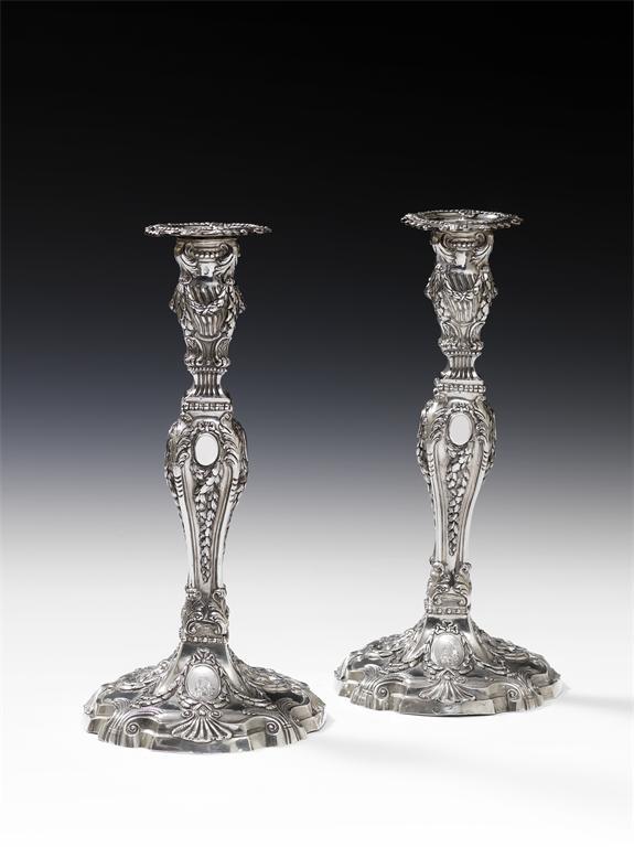 square baluster stems, with swags and foliate decoration, the fluted capitals with swags and foliate decoration, detachable drip pans, on raised shaped circular bases with similar decoration, engraved with a crest, height 30.5cm, approx. weight 64oz. (2)