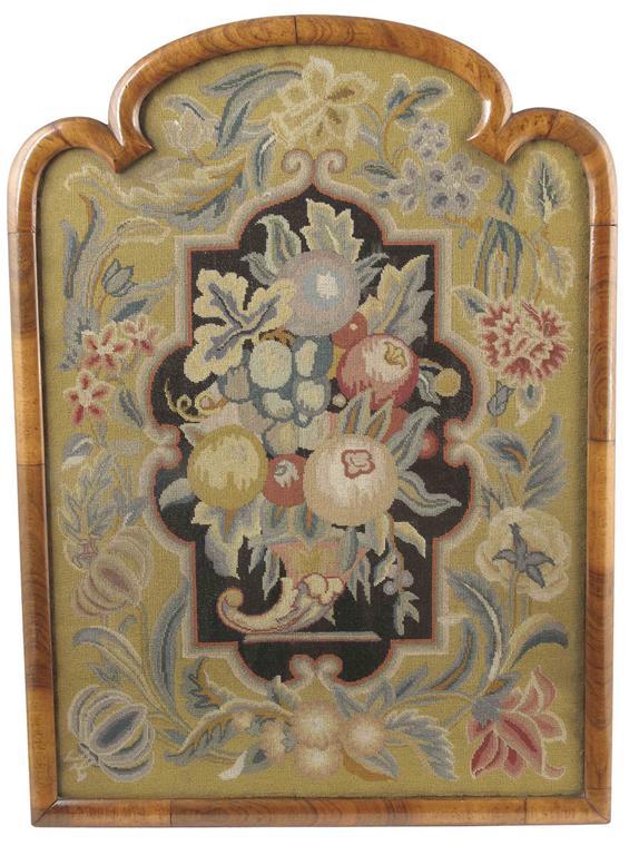 An 18th century needlework panel, of a central cornucopia of fruit to a yellow ground floral border in a later walnut frame, 24in (61cm) h, 17.5in (44.5cm) w.