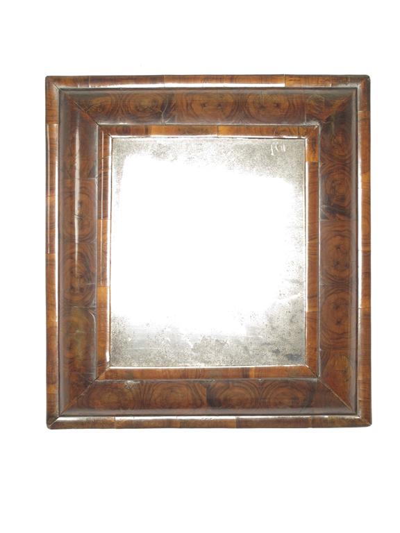 A William & Mary oyster veneered wall mirror, the rectangular plate to a cushion frame, the reverse with cresting grooves, 22.75 x 21in (57.8 x 53cm).